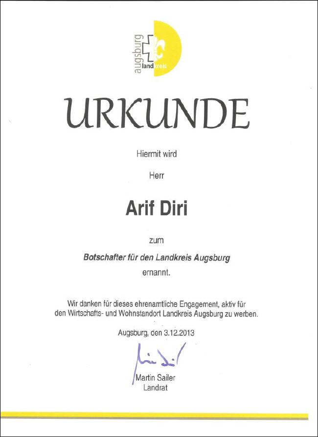 Ursula Jung, die Fraktionsvorsitzende von BÜNDNIS 90/DIE GRÜNEN hat in der Kreistagssitzung Arif Diri, 1. Vorsitzender Deutsch-türkischer Freundschaftsverein Bobingen, als Botschafter vorgeschlagen. Dem wurde von allen Vertretern aller Kreistagsfraktionen, einstimmig zugestimmt. Arif Diri wurde am 03.12.2013 mit einer Urkunde von Landrat Martin Sailer zum Botschafter des Landkreises Augsburg ernannt. Dabei sagte Landrat Martin Sailer: "Es macht uns große Freude, dass jemand mit türkischer Herkunft auch dazu gehört und uns im Landkreis Augsburg auch über Schönheiten seines Herkunftslandes, zum beispiel Istanbul, berichten kann. Auch als Vorsitzender des Freundschaftsverein kann er uns viele Erfahrungen von Bobingen und Umgebung weitergeben." Diri sagte dazu: "Ich freue mich, dass ich zu diesem wichtige starkes ehrenamtlichen Netzwerk für das Augsburger Land dazu gehöre und als erste türkischstämmige von 85 Botschafter tätig sein kann. Ich werde versuchen sowohl über viele Schönheiten in unserem Landkreis, als auch die, in meiner ursprünglichen Heimat Türkei, berichten."